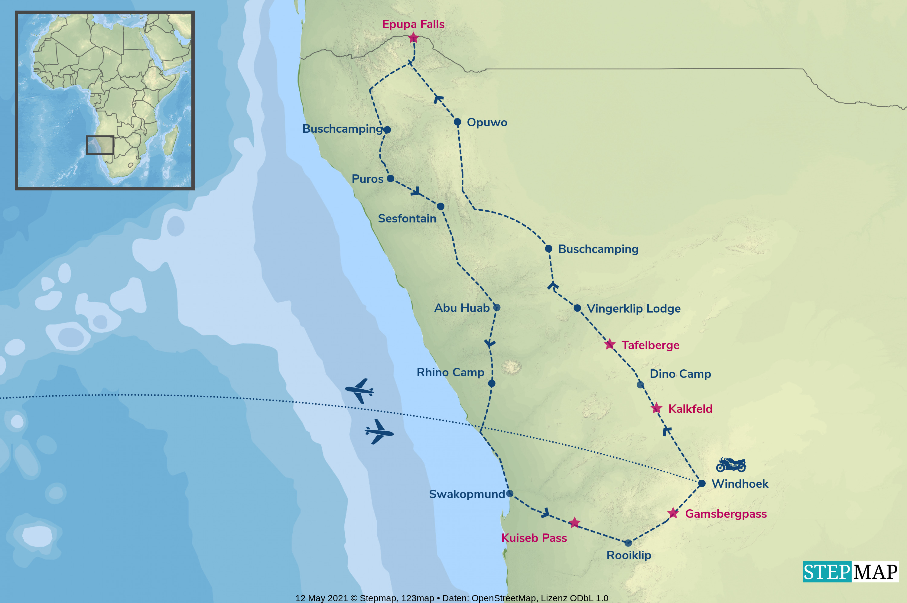 In Namibia herrscht Linksverkehr. Ein internationaler Führerschein muss während der Tour mitgeführt werden.