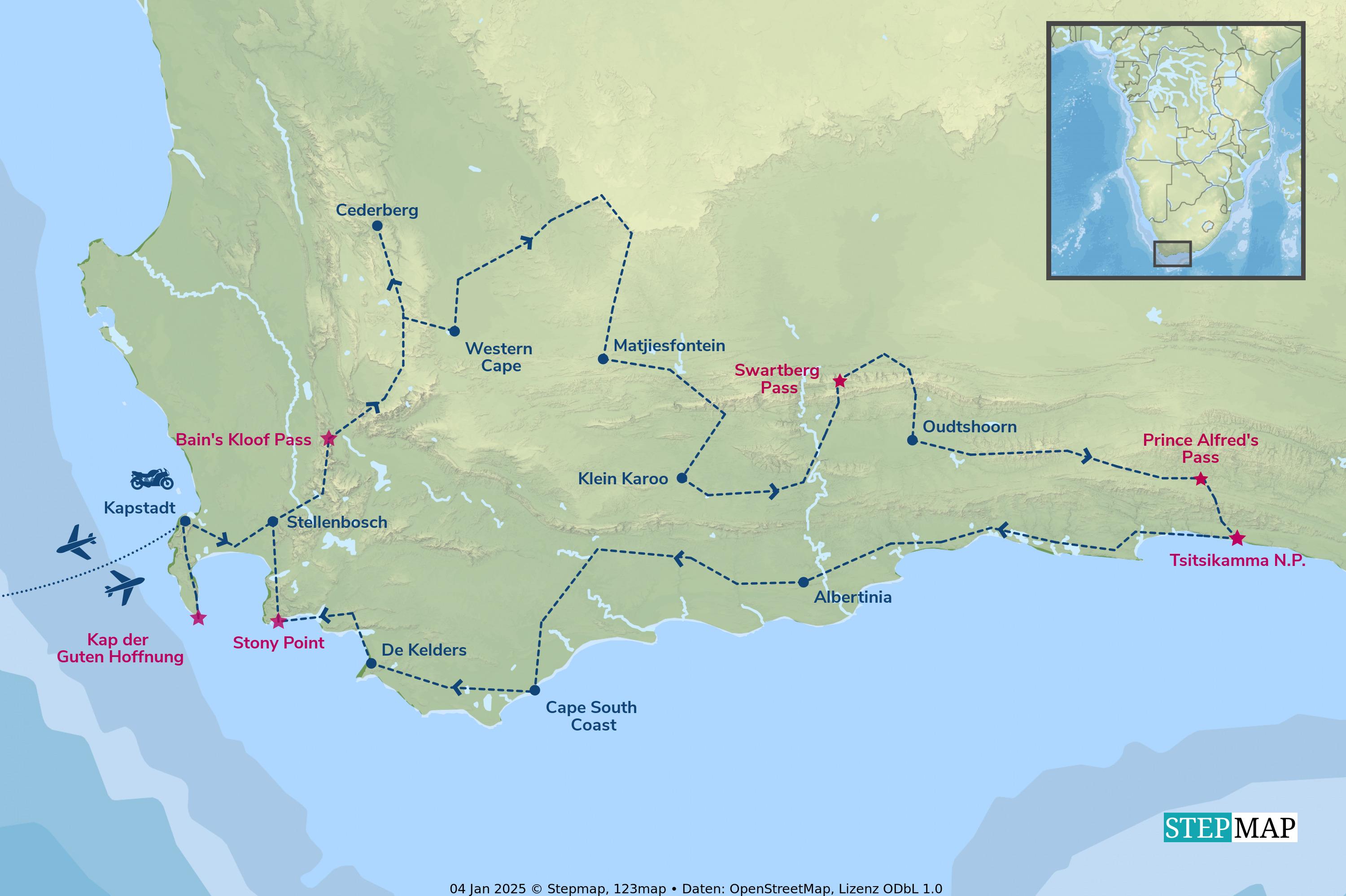 Ab hier geht es gen Westen und über die Sieben Pässe Straße nach Albertinia, weiter an die Cape South Coast und über De Kelders schließlich zurück nach Kapstadt.