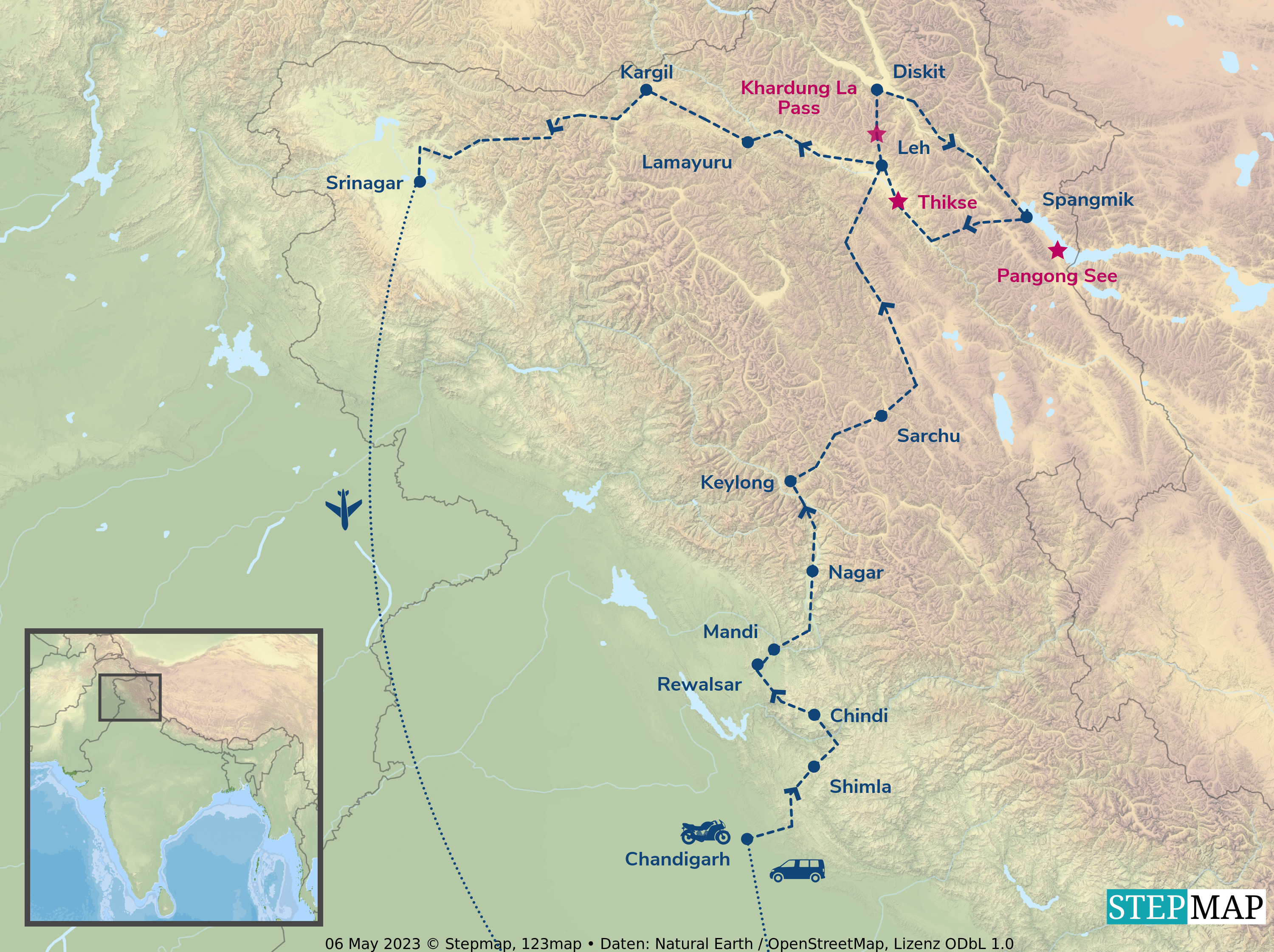 Von Chandigarh führt diese Motorradreise durch den Himalaya vorbei an grünen Reisterrassen und Obstplantagen in die Berge und über die hohen Pässe Ladakhs bis nach Leh.