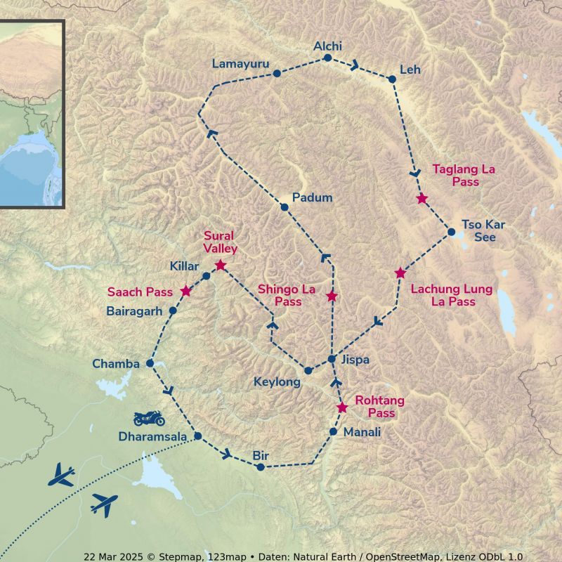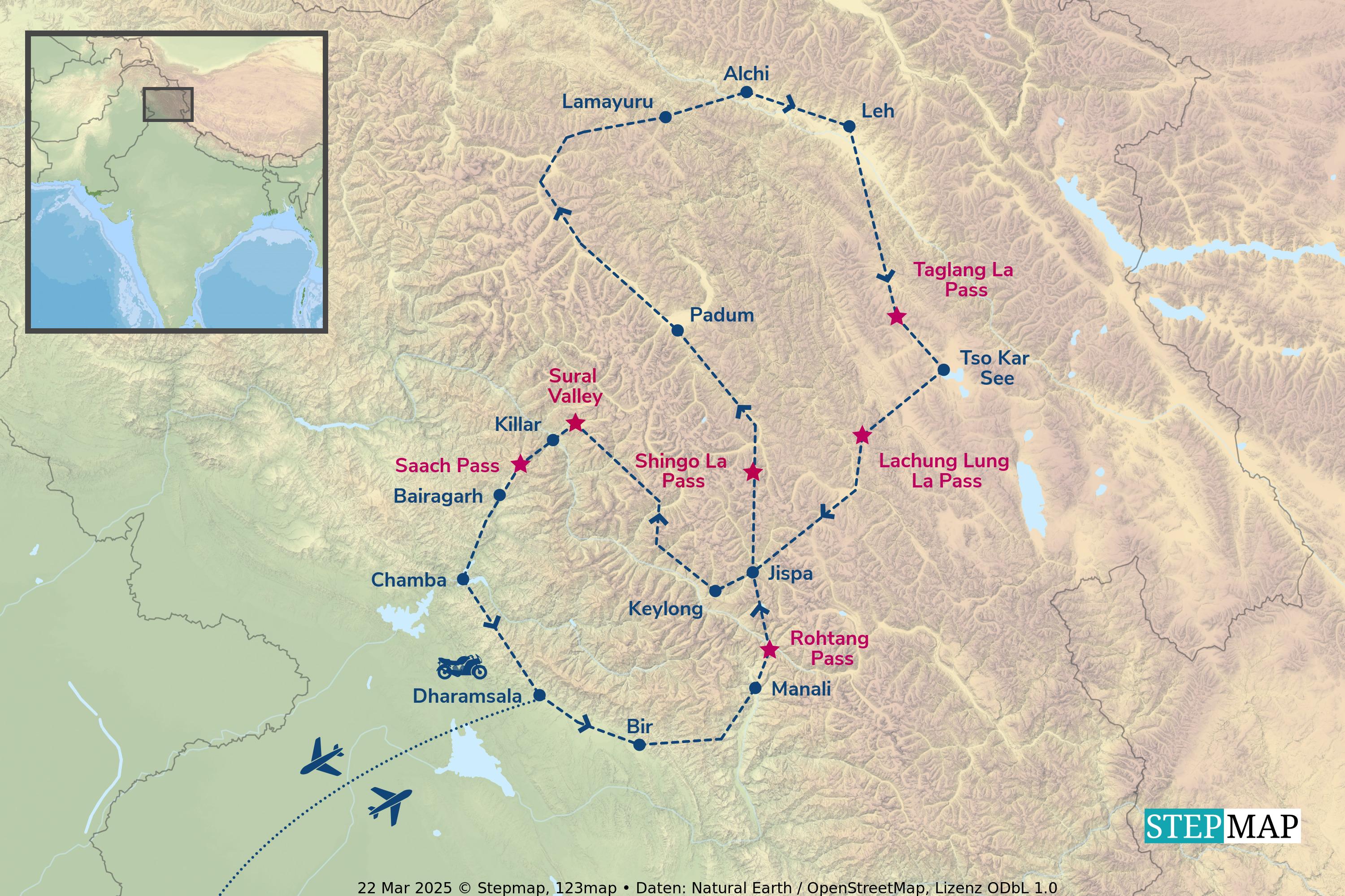 Auf dieser Motorradreise durch den Himalaya besuchen wir traumhafte Seen, umgeben von schneebedeckten Gipfeln und rauschenden Flüssen und fahren in einer unvergesslichen Rundtour über Zanskar nach Lahaul.