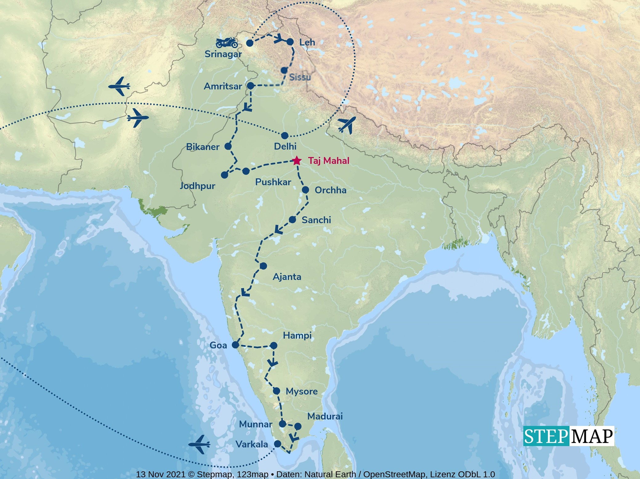 Von Delhi aus fliegen wir nach Srinagar. Über die Berge des Himalaya und durch Ladakh, dem Land der hohen Pässe fahren wir in Richtung Süden.