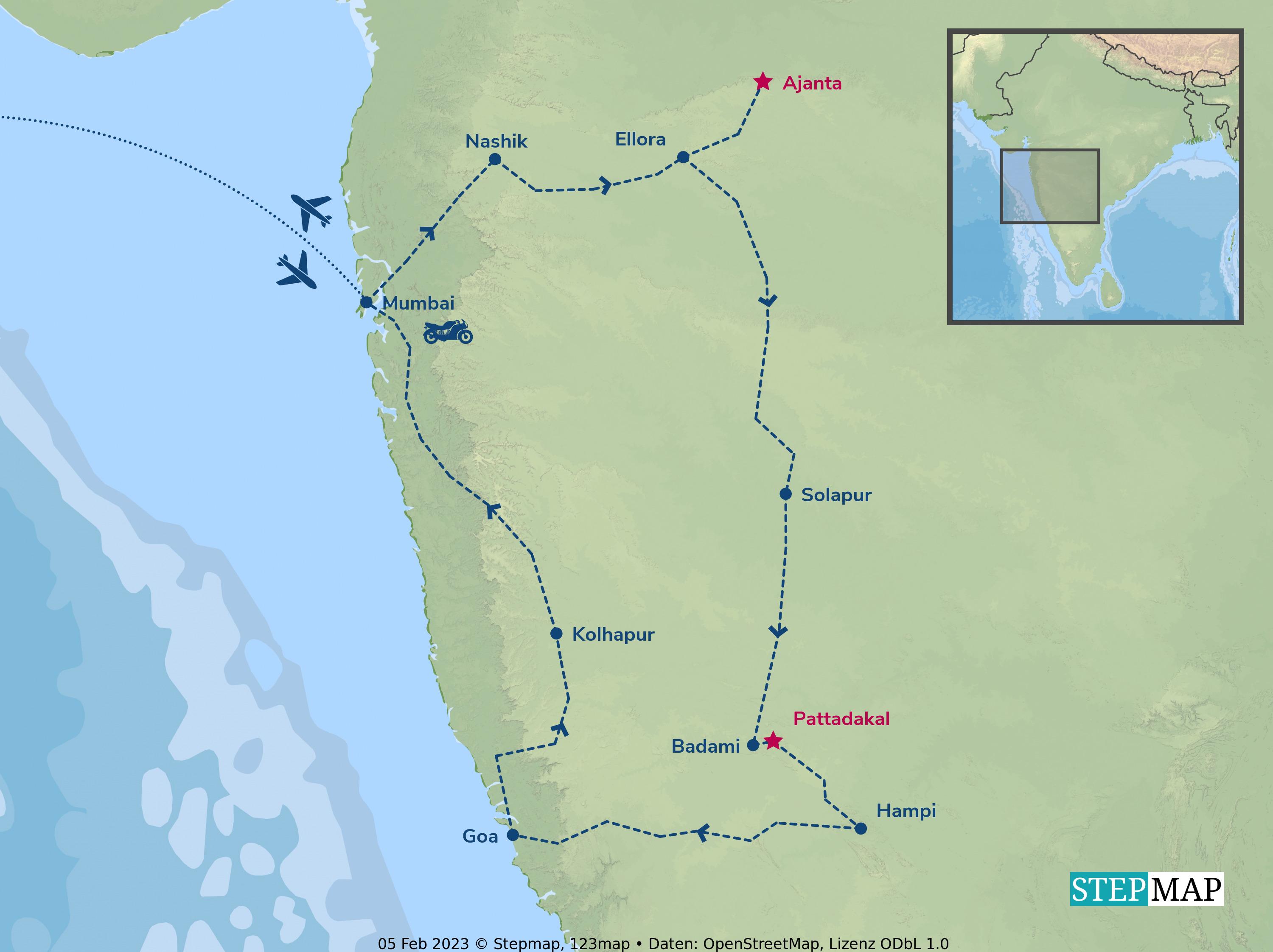 Wir reisen von der Mega-Metropole Mumbai im Bundesstaat Maharashtra, ins beschauliche Karnataka, weiter an die palmengesäumte Küste Goas und zurück nach Maharashtra.