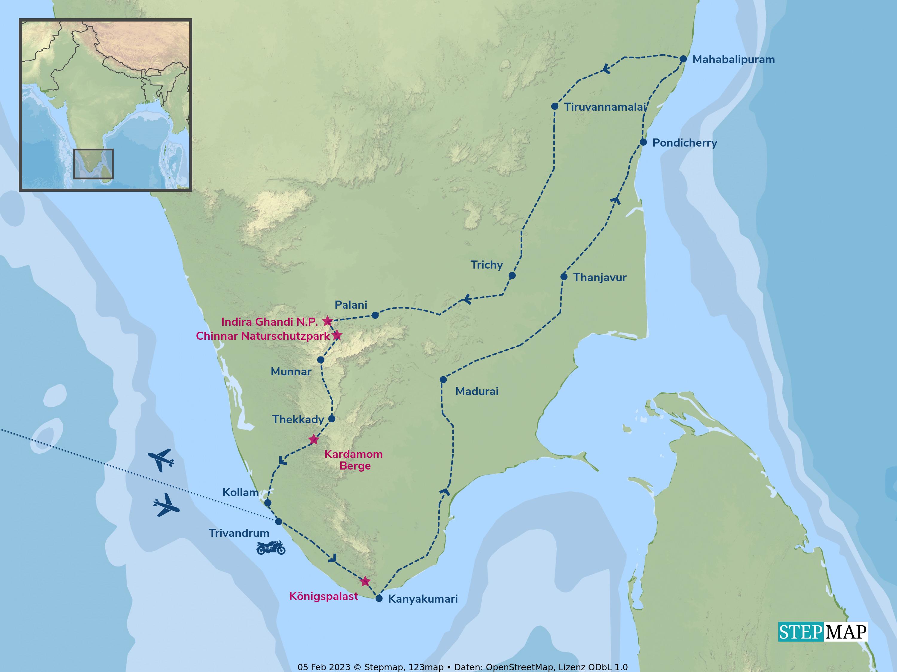 Der Süden Indiens im XL-Format: Auf der Strecke von Varkala an Indiens Westküste geht es an die Ostküste und in einem großen Bogen Richtung Norden wieder zurück nach Varkala.