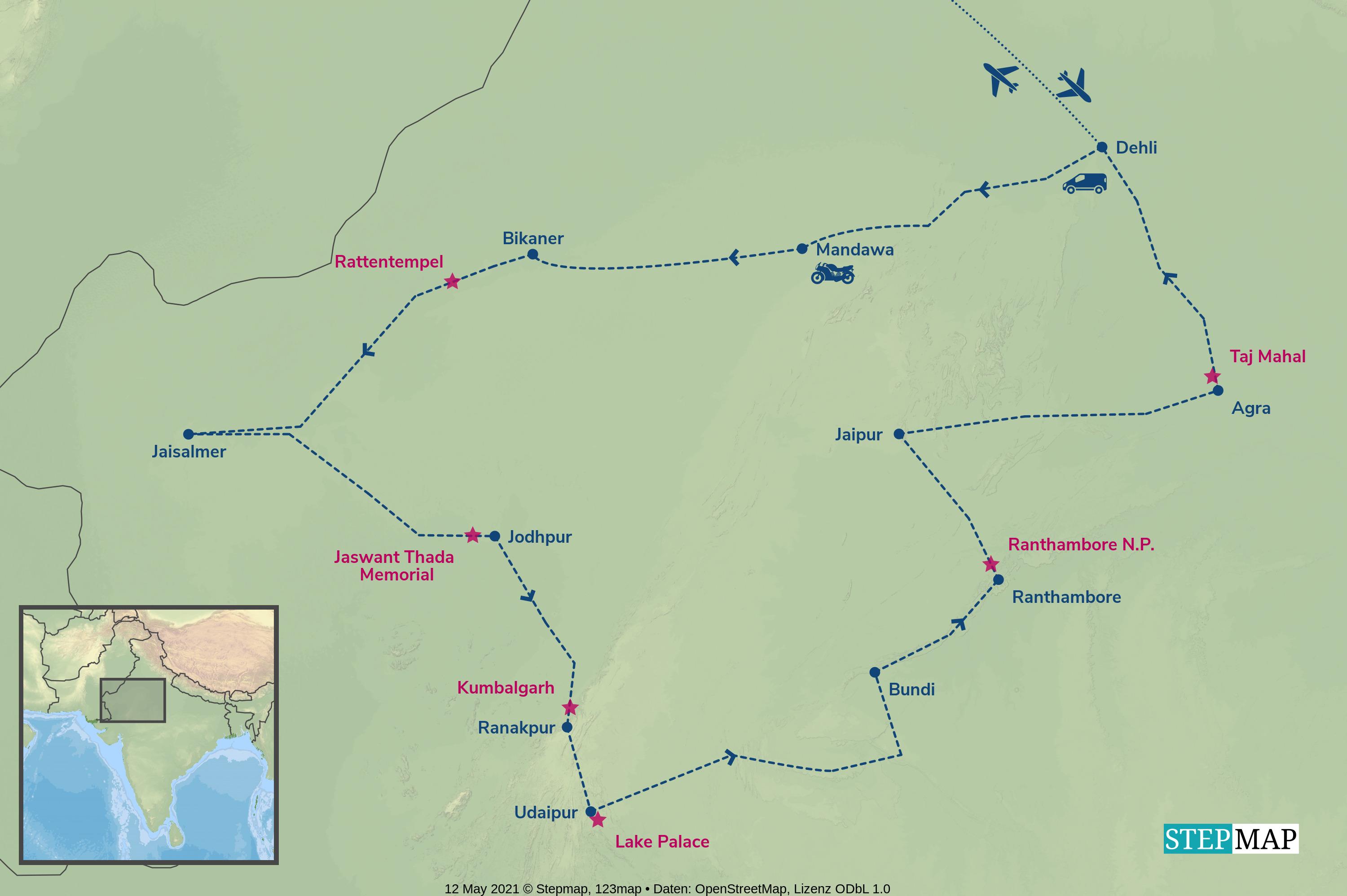 Über Jodhpur, Ranakpur, Udaipur und Bundi geht es nach Ranthambore. Nach dem Besuch von Jaipur und des weltbekannten Taj Mahal in Agra endet unsere Reise wieder in Delhi.