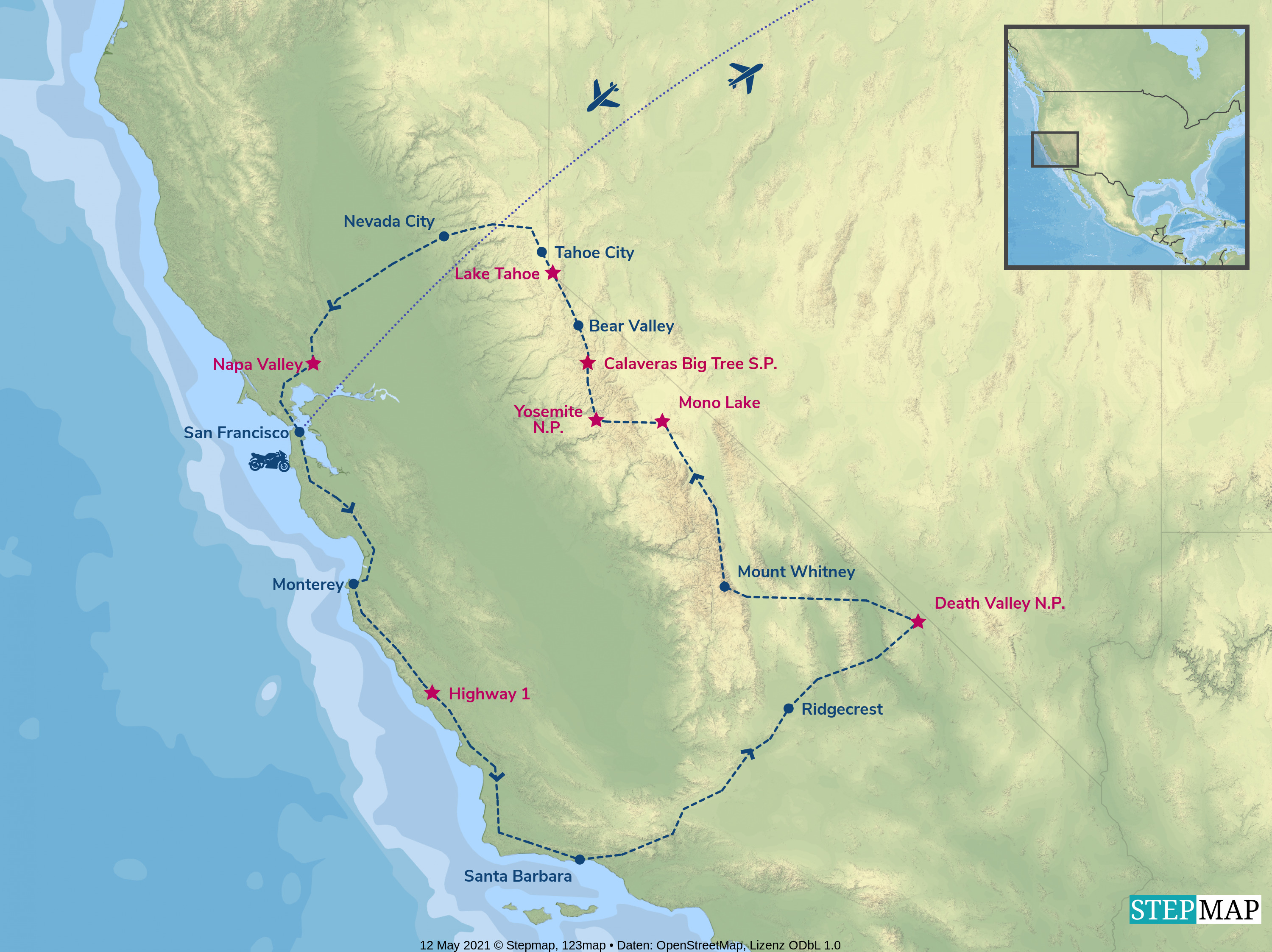 Durch das ehemalige Goldgräberland geht es via Sacramento, der Hauptstadt Kaliforniens durch das Napa Valley – hier kommen all die süffigen Weine her – zurück zum Pazifik.