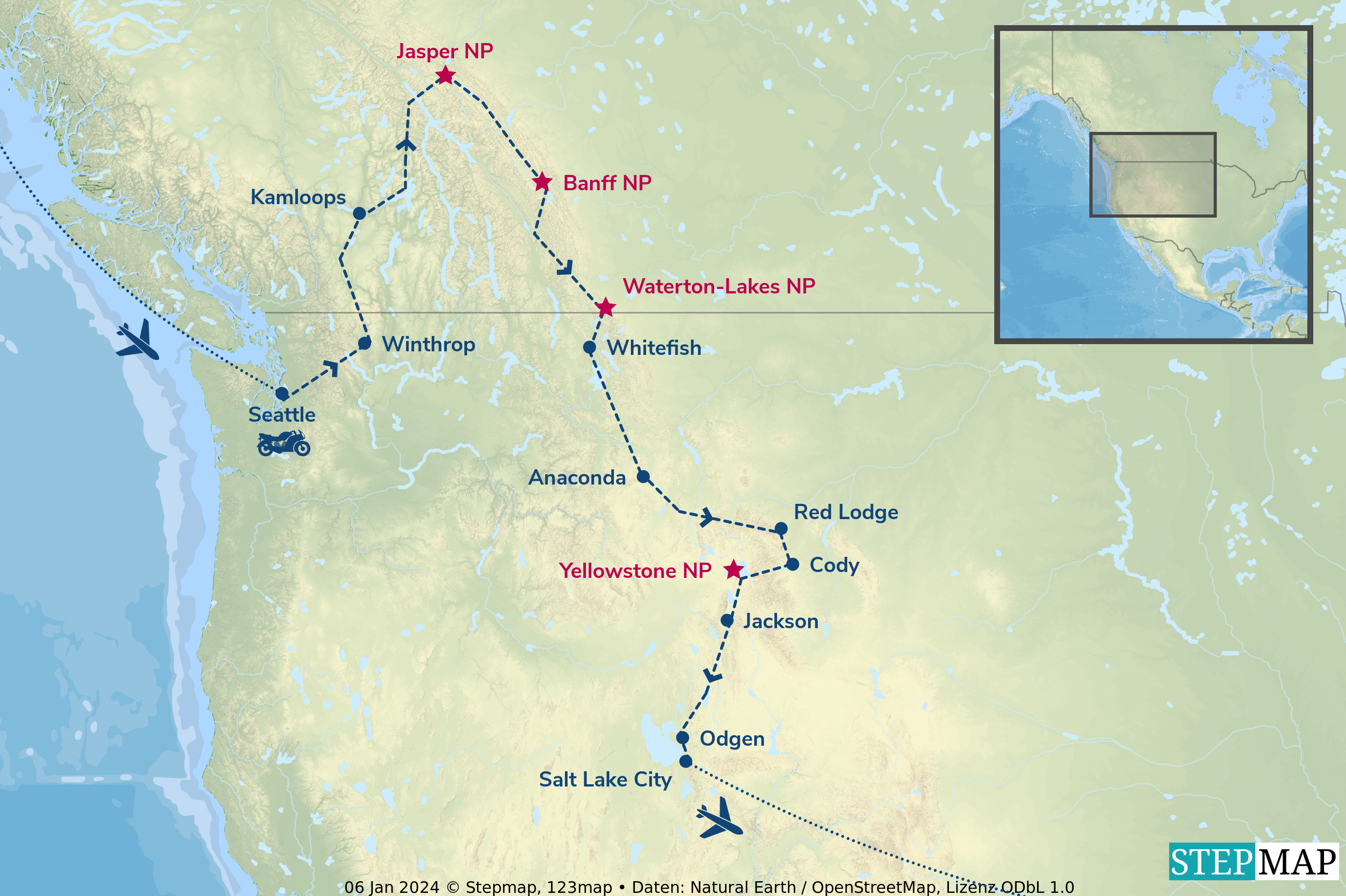 Wir starten in Seattle und fahren durch die Gipfel der Cascade Mountains, bevor es hoch hinauf in die kanadischen Rocky Mountains geht.