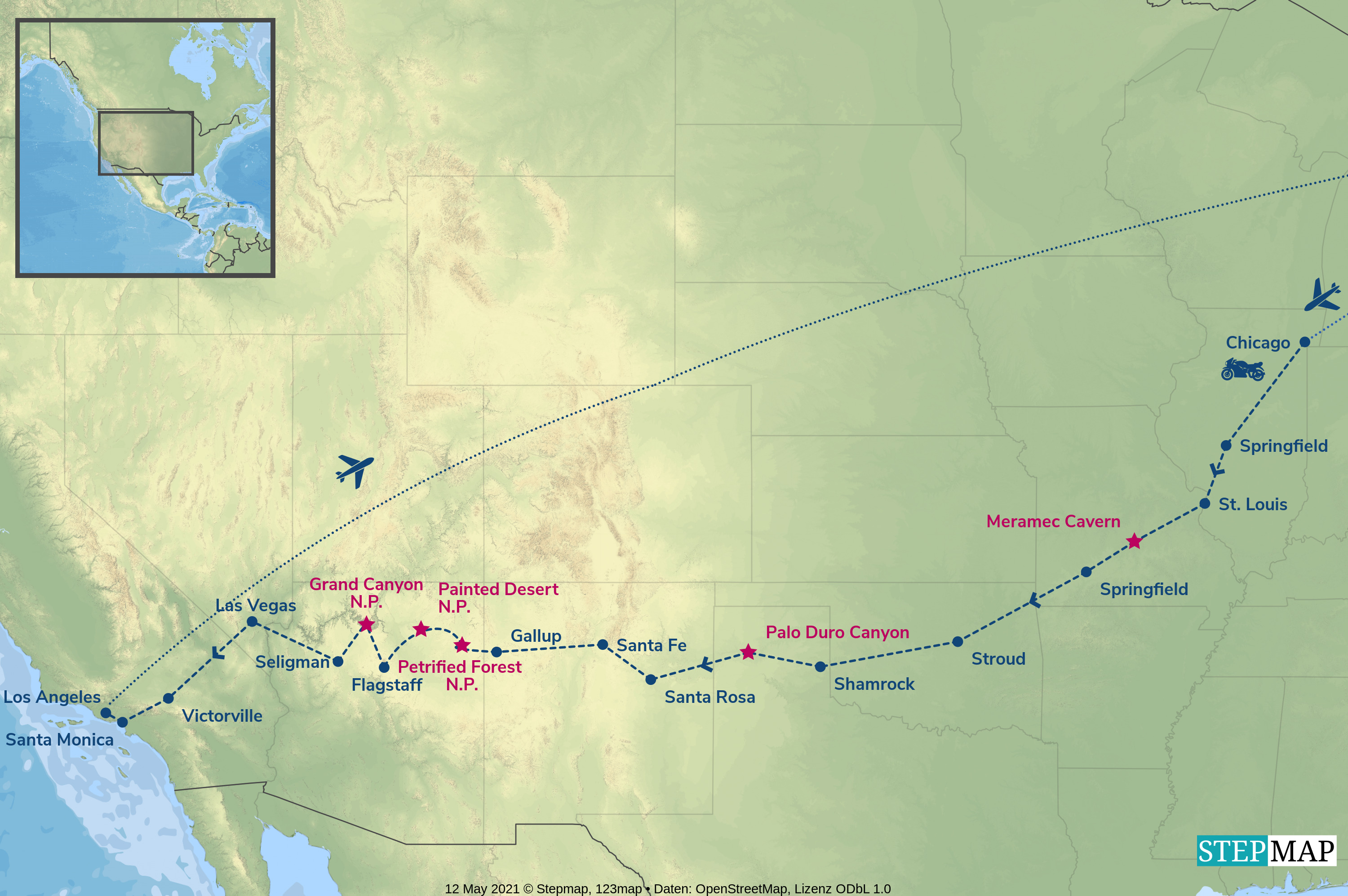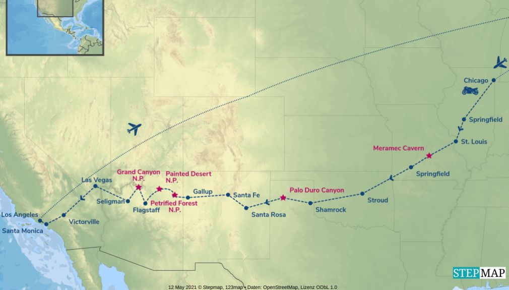 Unsere Route 66-Tour startet in Chicago und hat besonders auf den ersten Etappen mit  viel originales Route 66-Feeling zu bieten. Zahlreiche ehemalige 66-Wahrzeichen säumen unseren Weg: die Meramec Caverns, das Wagon Wheel Motel, das Red Cedar Inn....