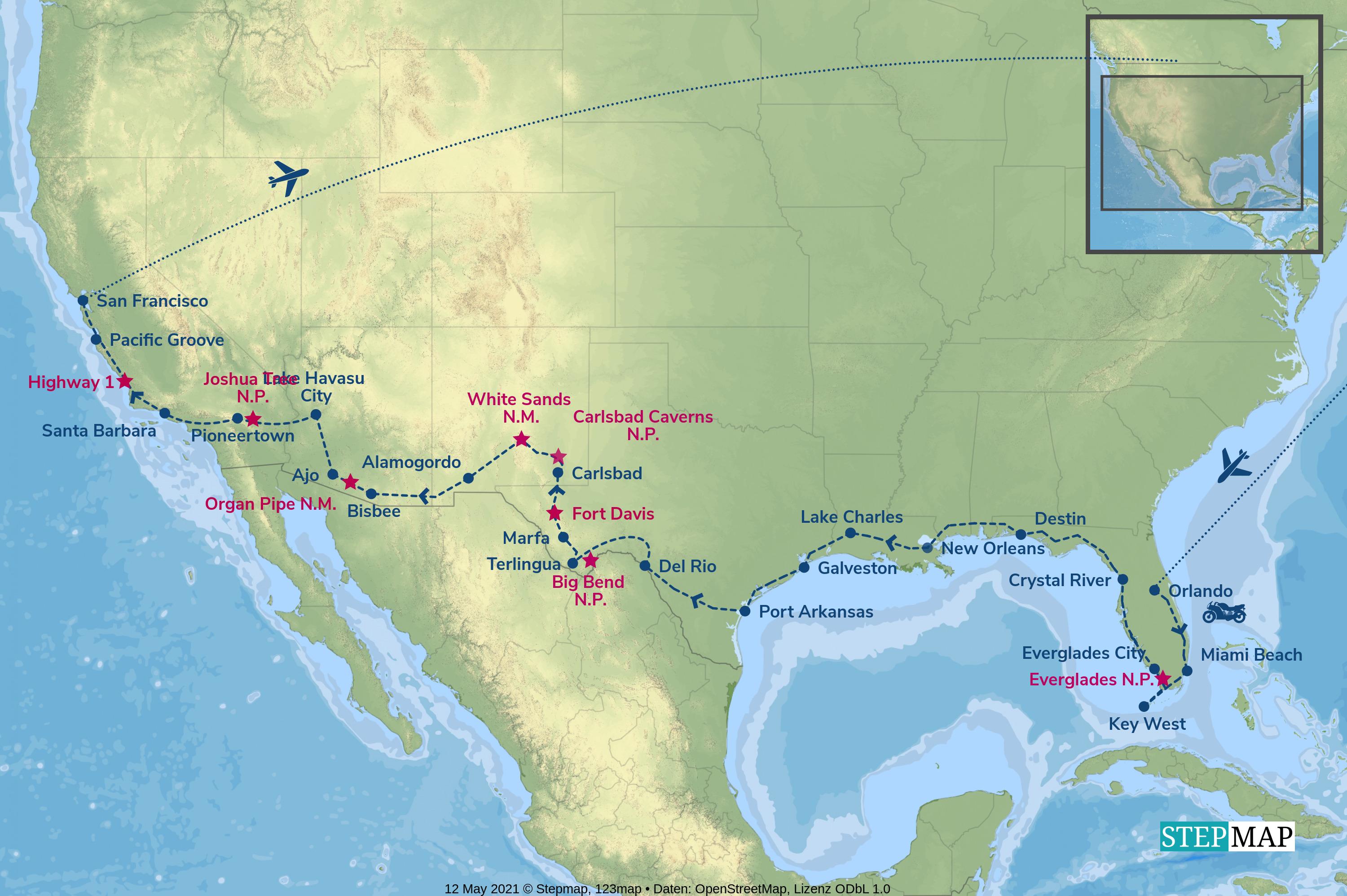 Wir cruisen quer durch die USA von den Everglades in Florida, durch die Südstaaten und die Wüsten entlang der mexikanischen Grenze und auf dem Highway 1 an der pazifischen Küste bis nach San Francisco.