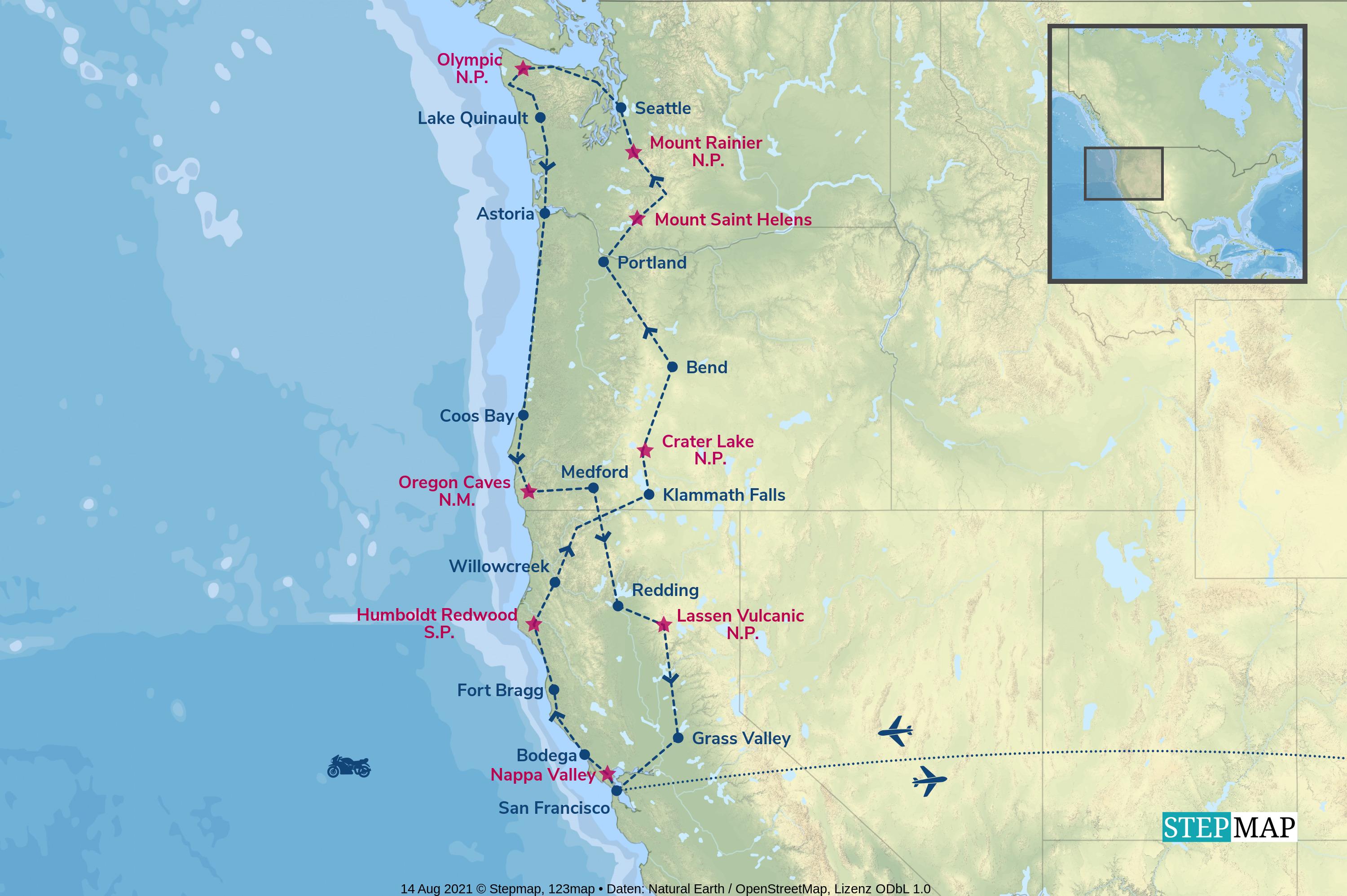 Diese herrliche Harley Motorradreise führt von Kalifornien, über Oregon nach Washington State. Lasst euch begeistern vom pazifischen Nordwesten mit seinen wilden Stränden, majestätischen Bergen, tiefblauen Vulkanseen, grünen Regenwäldern und entspannten Metropolen.