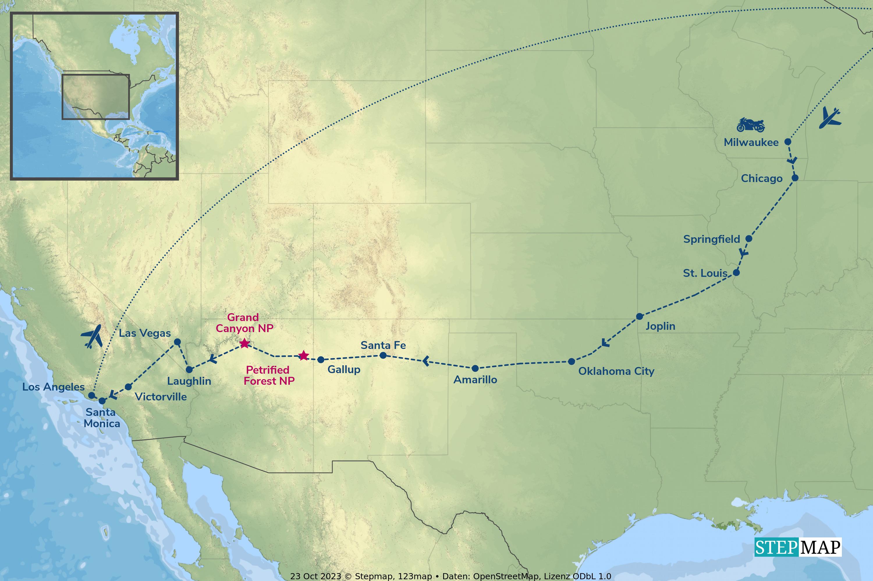 Über Chicago geht es nach Springfield und St. Louis weiter nach Missouri und Oklahoma. Nach einem Stop in Amarillo/Texas gelangen wir über New Mexico zum Grand Canyon in Arizona. Las Vegas darf natürlich nicht fehlen bevor wir schließlich Kalifornien erreichen und über Victorville unsere Tour auf dem Santa Monica Pier bei Los Angeles beenden.