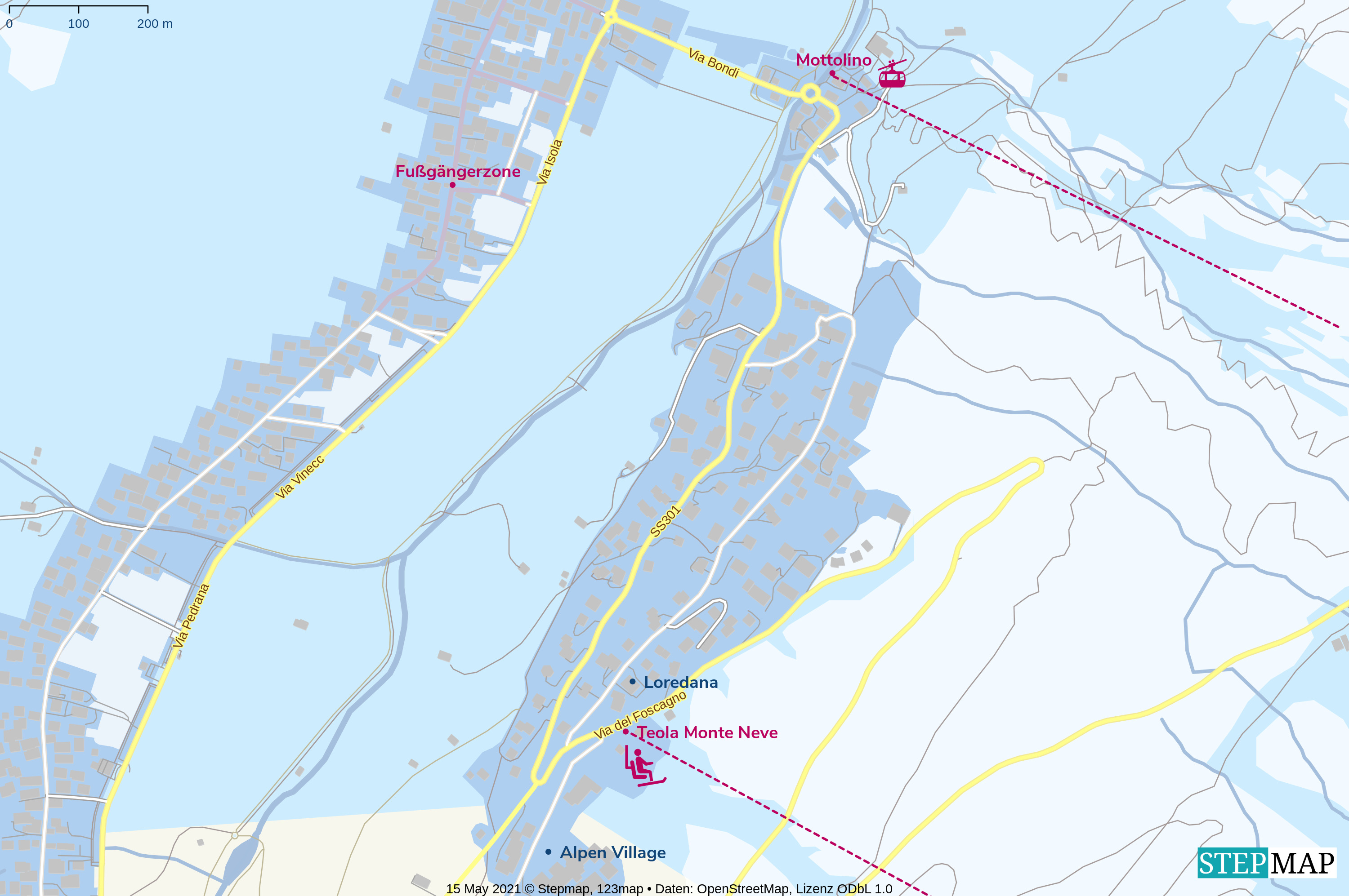 Ski in - Ski out! Das großzügige Hoteldorf Alpen Village hat die perfekte Lage für alle Skibegeisterten, liegt es doch nur wenige Schritte neben dem Sessellift Teola Piani Bassi und der gleichnamigen Piste des großen Mottolino-Skigebiets, welches alle Hänge der südlichen Bergflanke von Livigno erschließt. Den Carossello 3000 und die Hänge der gegenüberliegenden Talseite verbindet der Ski-Link, eine neue und schnelle Shuttle-Busverbindung (4 Minuten Fahrtzeit). Nachtschwärmern steht für den Ausflug in das rege Treiben von Livigno ein Shuttle zur Verfügung.
