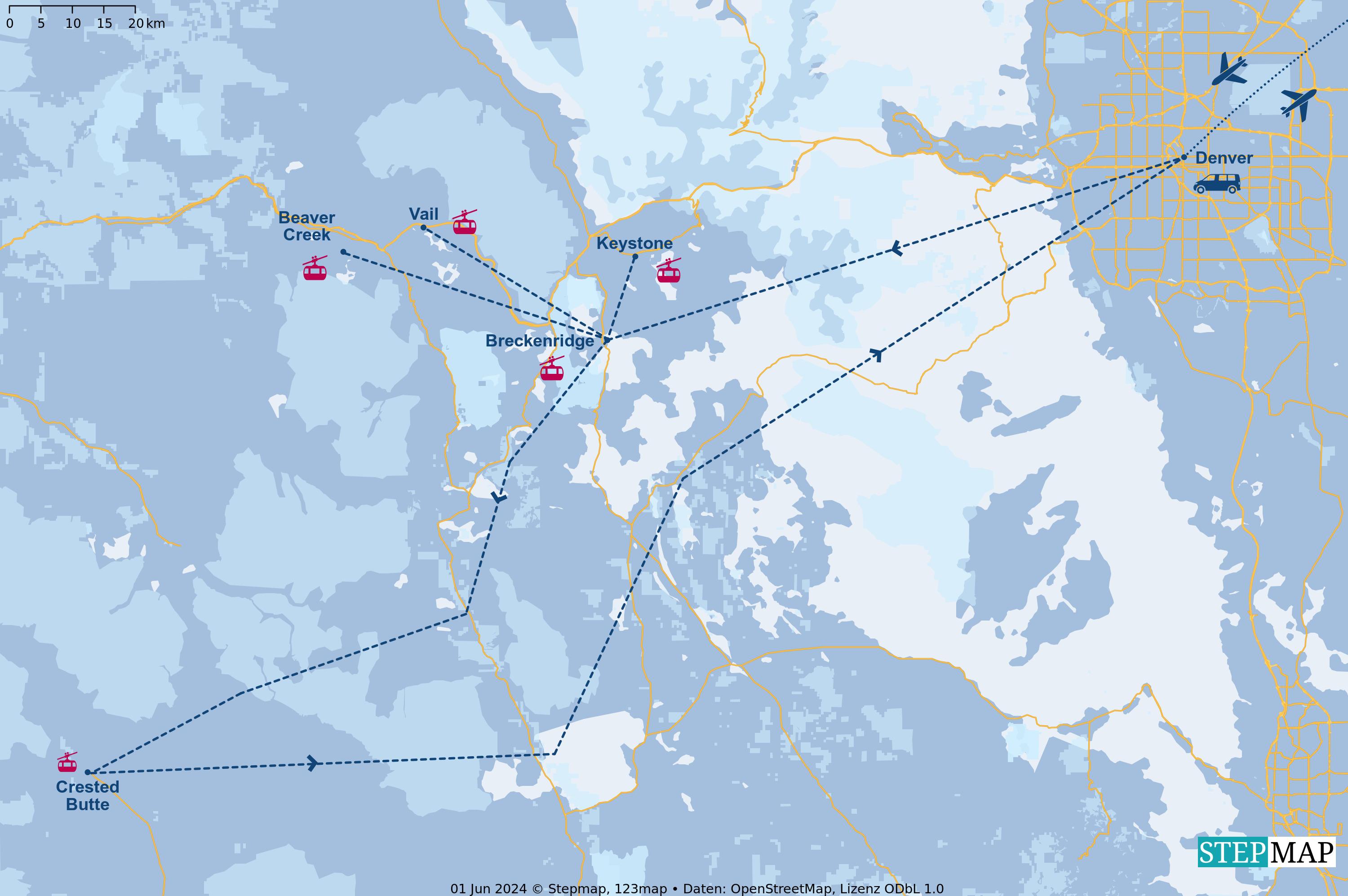Von Breckenridge aus erkunden wir die verschiedenen Skiareale in Vail, Breckenridge, Keystone, Beaver Creek und fahren im Anschluss für 3 Tage nach Crested Butte.